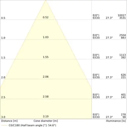 The colour code is a combination of colour rendering (CRI) and light colour (Kelvin). The first number indicates the colour rendering (1 = very poor colour rendering, 9 = maximum colour fastness). The second and third number contains the light colour. Example: the colour code 830 consists of good colour rendering (8) and warm white light (3000K). |